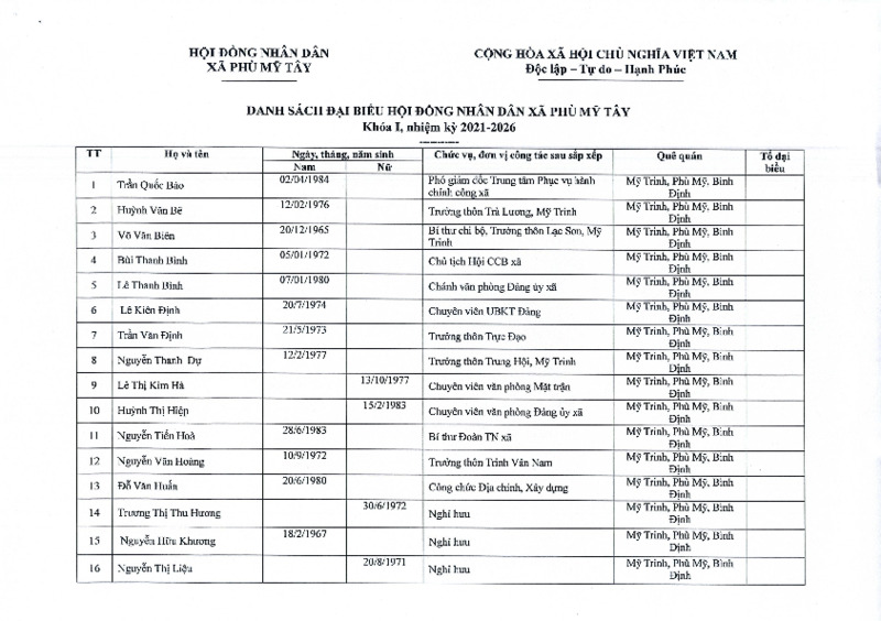 Danh sách đại biểu HĐND xã Phù Mỹ Tây Khoá I, nhiệm kỳ 2021 - 2026 16/10/2025, 10:49:10 - Lượt xem: 18 Tweet Thêm vào danh sách Báo xấu Thông tin tài liệu Danh sách đại biểu HĐND xã Phù Mỹ Tây Khoá I, nhiệm kỳ 2021 - 2026