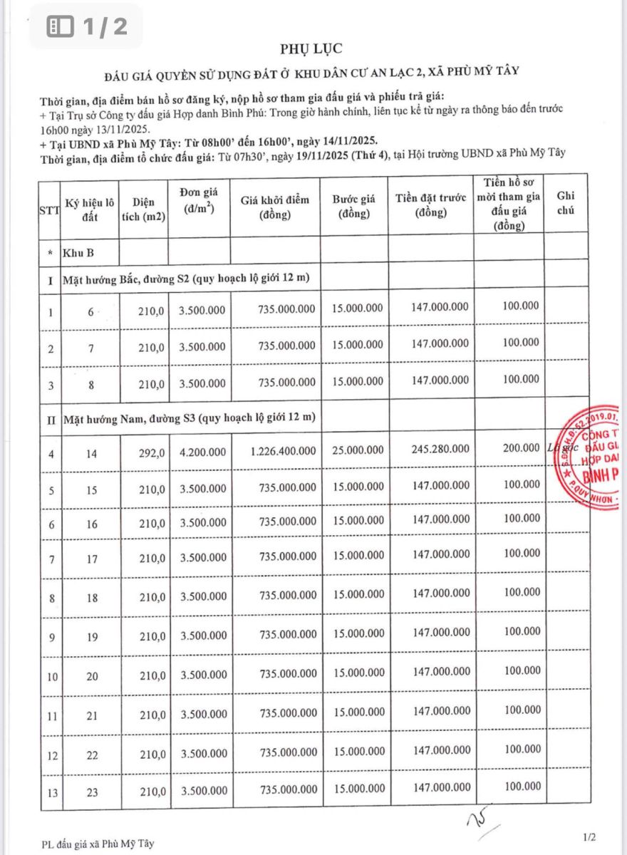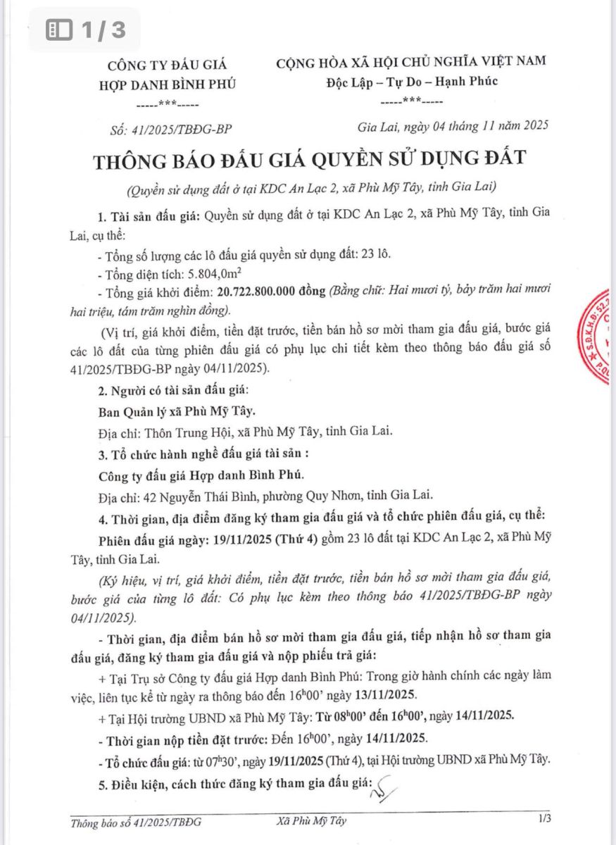 Phiên đấu giá ngày: 19/11/2025 (Thứ 4) gồm 23 lô đất tại KDC An Lạc 2, xã Phù Mỹ Tây, tỉnh Gia Lai.