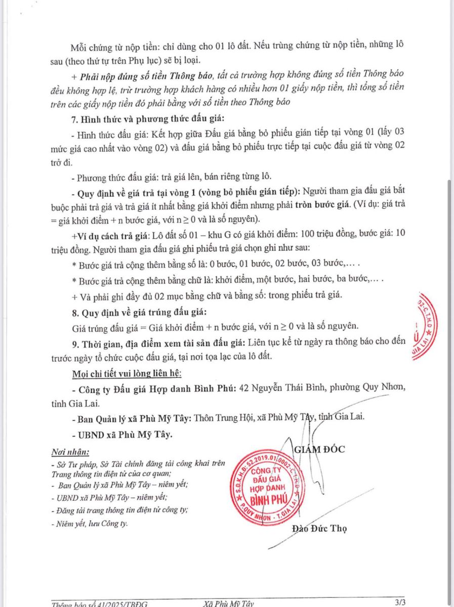 - Tổ chức hành nghề đấu giá tài sản: Công ty đấu giá Hợp danh Bình Phú. (Địa chỉ: 42 Nguyễn Thái Bình, phường Quy Nhơn, tỉnh Gia Lai).